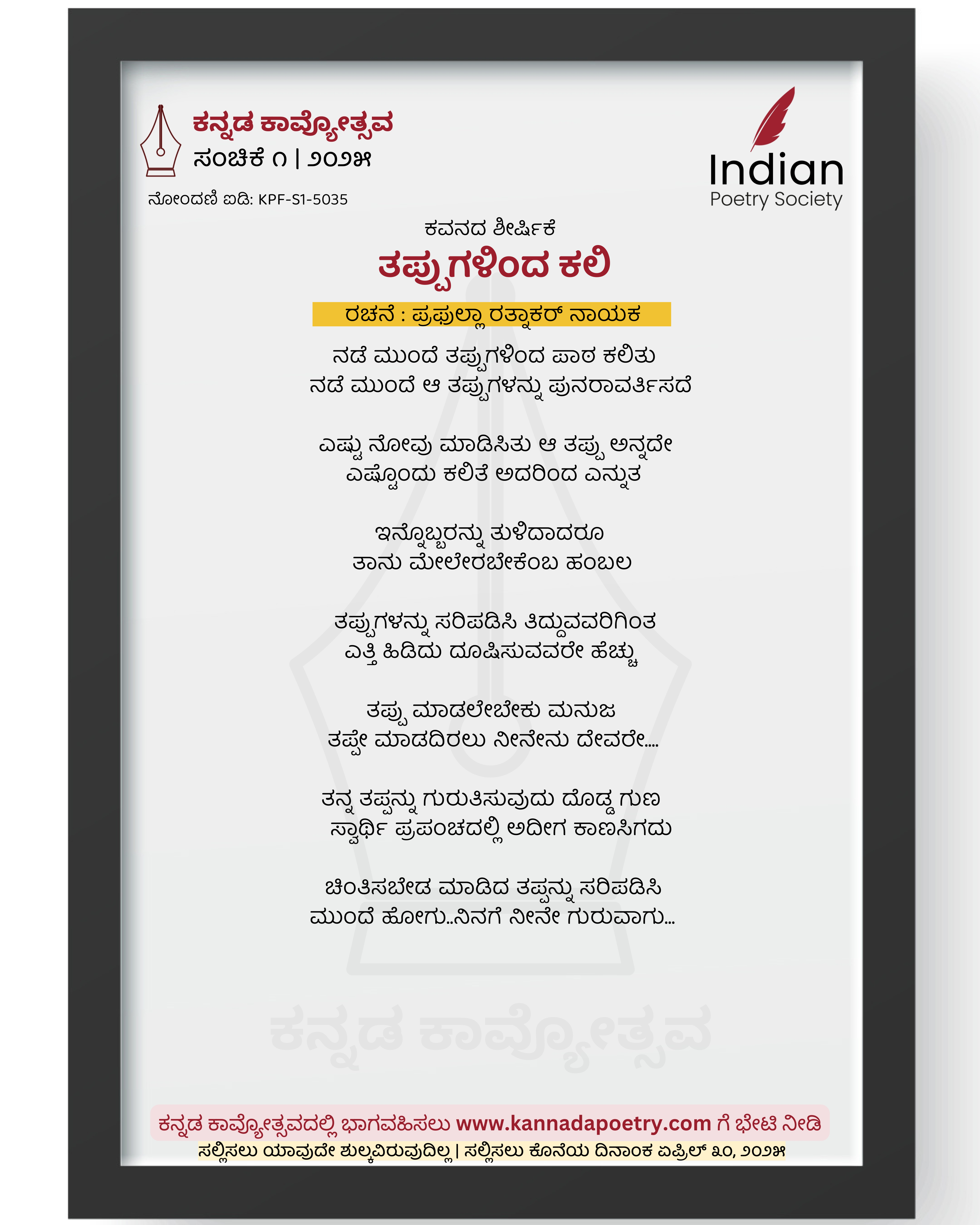 ನಡೆ ಮುಂದೆ ತಪ್ಪುಗಳಿಂದ ಪಾಠ ಕಲಿತು ನಡೆ ಮುಂದೆ ಆ ತಪ್ಪುಗಳನ್ನು ಪುನರಾವರ್ತಿಸದೆ ಎಷ್ಟು ನೋವು ಮಾಡಿಸಿತು ಆ ತಪ್ಪು ಅನ್ನದೇ ಎಷ್ಟೊಂದು ಕಲಿತೆ ಅದರಿಂದ ಎನ್ನುತ ಇನ್ನೊಬ್ಬರನ್ನು ತುಳಿದಾದರೂ ತಾನು ಮೇಲೇರಬೇಕೆಂಬ ಹಂಬಲ ತಪ್ಪುಗಳನ್ನು ಸರಿಪಡಿಸಿ ತಿದ್ದುವವರಿಗಿಂತ ಎತ್ತಿ ಹಿಡಿದು ದೂಷಿಸುವವರೇ ಹೆಚ್ಚು ತಪ್ಪು ಮಾಡಲೇಬೇಕು ಮನುಜ ತಪ್ಪೇ ಮಾಡದಿರಲು ನೀನೇನು ದೇವರೇ.... ತನ್ನ ತಪ್ಪನ್ನು ಗುರುತಿಸುವುದು ದೊಡ್ಡ ಗುಣ ಸ್ವಾರ್ಥಿ ಪ್ರಪಂಚದಲ್ಲಿ ಅದೀಗ ಕಾಣಸಿಗದು ಚಿಂತಿಸಬೇಡ ಮಾಡಿದ ತಪ್ಪನ್ನು ಸರಿಪಡಿಸಿ ಮುಂದೆ ಹೋಗು..ನಿನಗೆ ನೀನೇ ಗುರುವಾಗು...